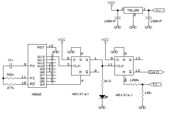 Circuit Description The LED is used to indicate a trigger has happened and remains on until Q4 goes high. Should the LED remain on for too short a time pin 4 of the 4013 can be alternatively connected to any of the remaining outputs (Q5..Q13) of the 4060. The second flip-flop will remain on until there is transmission from the DGH module. The module requires that the CONT pin is held low until there is transmission. If an indication is required that the DGH is transmitting, a LED in series with a 3k3 resistor could be wired between pin 13 of the 4013 and GND. Timing If there are any questions please email NOTE: This webpage does not form part of any official documentation.Any information contained herein is used at own risk. © M.T.P. - 20.07.01 |