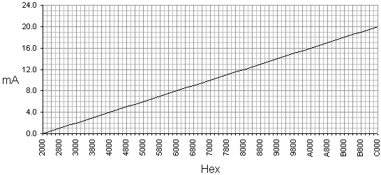 To make life simple the following graph provides a guide of current to hex value relationship. The range 2000h to C000h has been included as there are inputs and outputs capable of 0mA.