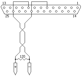 The termination resistor shown is the standard RS485 termination resistor as supplied by Elpro. If using TSX SCY CM 6030 cable for this connection, connect the Green/White, Orange/White, & Blue/White to the 105UC RS485 (+) terminal, and the White/Green, White/Orange, & White/Blue to the 105UC RS485 (-) terminal. When using the cable do not use the termination resistor, the PLC offers a resistor, via the blue-pair wires, on pins 11 and 23 of the connector. |
