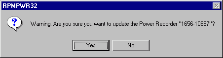 As you are making serious changes to the set-up of the Power Recorder the following warning screen is displayed. Before clicking on "Yes", it may be a prudent time to mention that any data recorded by the recorder is lost at this point. Everything is reset to defaults. Please ensure that you have downloaded any relevant data before executing this stage. If you are certain all data has been downloaded, then click on "Yes".