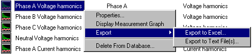 Begin by right clicking on "Phase A Voltage* Harmonics", and then moving the mouse pointer through "Export", and then selecting (by clicking on) "Export to Excel" or "Export to Text File(s)". This latter selection depends entirely on how you need the data presented to any external program. [ * or phase and input of your choice]