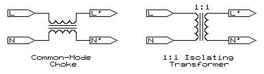 Coupling the 4th voltage to the main input network can be accomplished through use of either a current choke (also called a 'common-mode choke') or isolation transformer. The former method is better at transferring high frequency components i.e. harmonics, but lacks the ability to provide isolation on floating systems that use Faraday effect to keep the voltages within safe regions. L and N are connected to the source being recorded, with L' and N' being connected to the G and N inputs on the recorder respectively. If there is any doubt as to the voltages that could exist between the two systems then use an isolation transformer of required ratings. It is suggested that the VA rating be kept as low as possible so as to ensure the highest transfer accuracy of high frequency components. Please ensure you upgrade to Power Analysis Software (PAS) version 5.01.006 or later for analysing Neutral voltages that exceed 150Vrms (earlier versions only allowed to 150Vrms). All versions of Scenario are usable. If there are any questions please ask. Note: This web page does not form part of any official documentation. Any information contained herein is used at own risk. © M.T.P. - 17.04.02 / 20.04.05 |