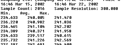 It has been frequently commented that there is no time stamp. What there is, however, is a start date-time and an end date-time. What is not commonly known is the "Resolution" is the "time between readings" value (and is in seconds, unless otherwise stated). In our above example screen shot the value is 300 seconds, which is 5 minutes. Therefore, the first reading is taken at 15 March 2002 at 16:46, the second is therefore at 16:51, the third at 16:56, and so on.