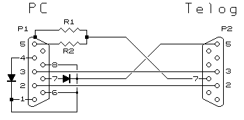 Some drivers will not bring the RTS high without active CTS, DSR & DCD signals. In the final version of the cable, a pair of diodes are used allowing either the RTS or DTR to supply the required signals. Those unfamiliar with RS232 communications may wish to refer to this web-page on PC RS232 ports. In most cases, dispensing with the resistors and connecting Pin 5 of the PC directly to Pin 7 of the Telog will work. However, it has been known for many notebooks to not have Pin 5 (signal ground) connected. R1 and R2 provide an "alternative ground" arrangement for this situation yet limit any ground loop currents that may exist should both Pin 5 and the case be connected within the PC. A full explanation regarding this can be found here. R1, R2 - 10 to 22 ohms, ¼watt resistor. D1, D2 - 1N4148, or other suitable signal diode. P1 - DB9 female connector P2 - DB9 male connector