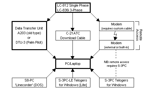 Below is a guide showing the primary components of a Telog Linecorder system. Only the two models available in Europe are shown being the LC-812 (single phase) and LC-836i (3-phase). Each phase is capable of measuring Voltage and Current.