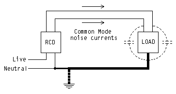 Sadly, we don't live in a perfect world and my definition of leakage actually exists in reality; this being that currents will use undefined paths on their way out of and return to the source. With the current being unequal, the uncancelled magnetism permeates the RCD core, this feeding the secondary, this feeding the electromagnet, this then causing the breaker to trip. Ok, all sounds relatively simple and so endeth a very basic lesson on the "mechanics" of RCDs. Leakage as a result of capacitance is the major player in all of this. Although the wiring's capacitance plays a significant part, modern appliances "take the cake" with all the filters found on them! Even washing machines can boast a minimum of 4.7nF capacitors from both Live and Neutral through to Earth. It has been found for this to be as high as 10nF on some devices. Because Live wiggles about, and Neutral doesn't, means the capacitance found between Live and Earth will conduct current while the capacitance between Neutral and Earth does not (because there is, relatively speaking, much less voltage between Neutral and Earth as opposed to Live and Earth). This creates an unbalanced and therefore uncancelled current in the RCD's core. So what does not help is RCDs protecting circuits feeding lots of hi-tech equipment (and nowadays this means the modern home too). Revisiting the page on Leakage (especially hi-tech devices with EMC filters) will show these contribute to the unbalanced currents seen by the RCD. This effectively 'biases' the RCD i.e. will reduce the genuine leakage current required for the RCD to trip. Depending on the level of leakage, RCDs can be found to be "living on the edge" where it takes just a small amount of extra leakage, such as the switching on of an appliance thus upsetting the balance for just a tiny moment, and 'thwack!'.. the RCD trips. The RCDs would usually accept these tiny upsets, but being biased by all the capacitive leakage minimises the chances of the little 'blip' remaining below the RCD threshold. With respects to "living on the edge", there is one thing not commonly known is that RCDs will trip when subjected to continuous current of about half their rated trip current i.e. 15mA on a 30mA RCD. This is to ensure compliance with required "speed of trip" under human touch faults. Also, if a dual-function breaker (RCD and over-current breaker in one), there is just a feint chance the breaker has become weaker (over-sensitive) over time - especially if subjected to a ream of violent trips in its life. This is, however, said with reservation as I have not yet experienced such an RCD (and have only heard of the odd one) in my life, but I'm not saying the situation does not exist. Let us now examine noise! If the noise on a mains feed is differential mode (i.e. superimposed on the waveform e.g. transient) then the current would go out on the Live and return on the Neutral. As these are fed through the same core with the currents flowing in opposite directions, they would cancel - in other words nothing would happen. At first glance common mode noise, i.e. when the same noise appears on both Live and Neutral in phase and amplitude (a full explanation of this appears in common mode noise) is not an issue either as it makes no difference to the RCD that both the Live and Neutral (as a pair) are at some potential above Earth. When one adds in the capacitance, however, the situation changes. With common mode noise the Live and Neutral 'move', as a pair, relative to Earth causing currents to flow from Live as well as Neutral through to Earth. The problem is these currents flow in the same direction and therefore combine in the RCD core rather than cancel. The result of this, well, I think you've guessed. Wiring capacitance is relatively small meaning the common mode noise would have to be rather large to have this effect on the RCD. Again, the filters on modern appliances sure don't help and drastically reduce the level of common mode noise required to cause a trip (not just through the L-E and N-E capacitors, but also because they strap a rather large capacitor across L-N forcing the two to move toegether!). Till now it has been said that Live and Neutral move, but the same effect is seen should the Earth move with respect to Live and Neutral. Nuisance tripping can therefore occur with sudden shifts in the ground as, through leakage, common mode currents on the Live and Neutral again add in the RCD core and, if large enough, will be detected as an imbalance and trip the RCD. Such tripping is highly possible where Earths are weak and/or tied to surrounding earth points like water pipes etc. i.e. points where noise can be introduced into the system. As is, T-T systems have no connection between Neutral and Earth making them exceptionally vulnerable to nuisance tripping through common-mode noise (unwanted voltage between Live & Neutral as a pair and Earth). With TNC-S, the Protective Earth is derived from the Neutral as it enters the property. At this point the Protective Earth is also attached to the nearest water and/or gas line. The Live and Neutral are fed through the RCD and the Protective Earth is not. Should the Live and Neutral not follow the same path to an appliance as does the Protective Earth (hot water immersion heater is a prime example, even a washing machine would do it!), then it is possible for the RCD to be part of a large magnetic circuit. Induce fast changing magnetic fields into the circuit and the currents will manifest in the RCD. Other possibilities are defective ring circuits. If the Live and Neutral are not each a complete ring i.e. magnetic fields are not cancelled, it is possible for noise to be generated on to the circuit. The RCD will see this as an imbalance and, again, trip.