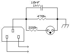 It is strongly suggested that should you do this modification to any instrument you clearly mark it in such a way that no ambiguity exists and also, when being used, the instrument case is shown to be live. It is often required that an instrument not be strapped to earth via the mains connector, be it that earth loops are created when testing within a circuit, or that the device under test has a chassis potential away from earth and could result in damage should earth be connected to it. A prime example of the latter is a TV set. When testing such equipment it is often desired that the instrument not be earthed but when not in use the chassis of the instrument be at least at earth potential. Many times, too, having a soldering iron "hard earthed" can result in damages to equipment being repaired but disconnecting the earth can result in the tip "floating" at approx. 125VAC (half way between 0 and 250VAC) due to capacitive coupling between the element and the casing, this possibly leading to damage of very sensitive equipment being worked on. In both cases it is then desirable to "soft earth" the instrument or appliance. This is done with a typical circuit shown below. This circuit is usually no more than a 470 kilo-ohm resistor and a 10nF/1kV capacitor in parallel, this combination then placed in series with the earth lead. The circuit below has, however, a further resistor and neon lamp shown. This serves as an indication that the chassis is at an unsafe potential and to be treated with the utmost of respect!