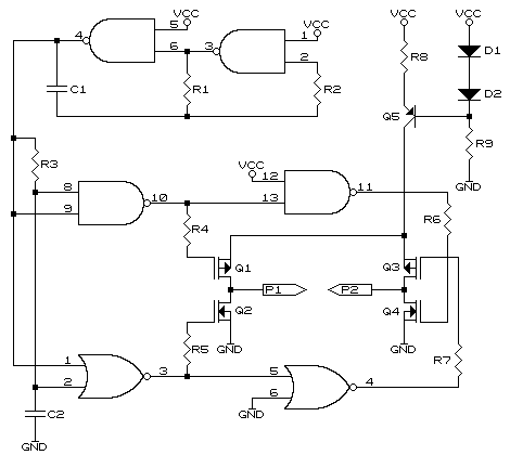 R1 270k R2 560k R3 270k R4-R7 2k2 R8 12 ohms R9 2k2 C1 47uF C2 470nF D1-D2 1N4148 Q1, Q3 any suitable P channel mosfet Q2, Q4 any suitable N channel mosfet Q5 any suitable PNP transistor Please note the above circuit has not been tested and is for guidelines and experimentation only.