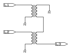 WARNING: Voltages used are likely to be at lethal mains potential. Exercise extreme caution and have only qualified personel carry out permanent installation. The circuit shown below is not recommended for use where high currents are drawn or for legal monitoring purposes. Limitations are to be expected. During measurements or the testing of three phase equipment or when monitoring three phase supplies it is often found only two of the phases are available at 'safe' potentials of between 63 and 220 volts. This is usually due to the costs of the voltage transformers that reduce the incoming multi-kV to the levels mentioned. The following circuit generates the missing phase from the two supplied ones with sufficient power to drive 3 phase meter circuits and small instrumentation motors. It creates a new vector by addition of the supplied two. It will, however, be noticed the new phase is inverted (notice the phasing of the transformers), this is done to correct the polarity as the addition creates a vector ±60° from the two supplied when it should be ±120° to be correct.