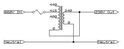 Testing to ensure the phasing of the two windings are correct should be conducted at low and safe potentials. This should comprise of 12VAC injected into the output side (i.e. across the Neutral and 238V Out points) and, if all is well, 33VAC should be measured across the 660V IN and Neutral. If this is not achieved swap the polarity of one winding only. If this test is successful only then should this circuit be implemented at full potential. Should measurements of 3 phases be required 3 such transformers need to be employed, please note that they should be mounted with at least 25mm (1 inch) seperation to ensure no cross magnetisation occurs which could affect readings. A suitable transformer is available from RS Components, Cat. No. 180-190. The transformer features a 400/415/440 input with a 240 output, the 415V tap is suggested as this offers a very workable ratio of nearly 2.75:1 (660V:240V). This transformer also features some desirable characteristics especially with regard to insulation (as copied off their website).